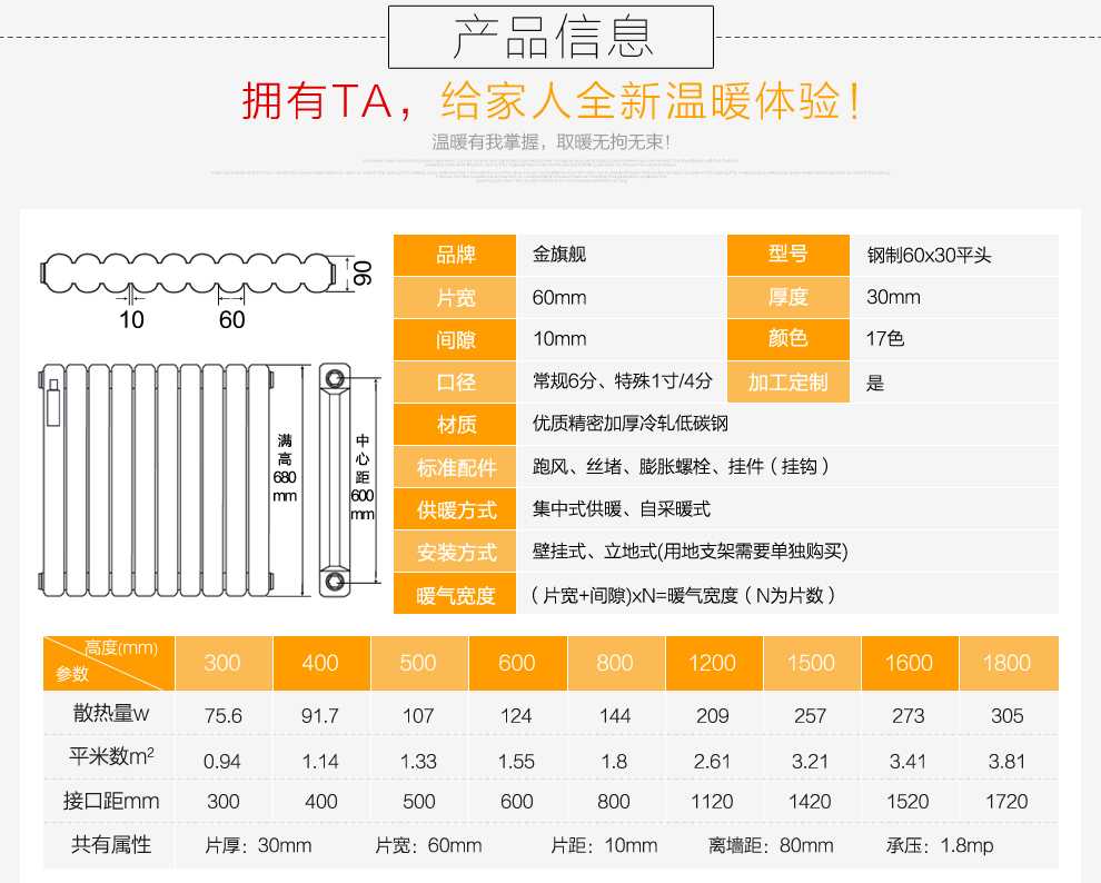 金旗艦鋼制暖氣片,一體成形,無焊點(diǎn),水流量大,壽命長,造型美觀;具有熱穩(wěn)定性好,附著力強(qiáng),耐腐蝕強(qiáng),耐久性高、光澤度強(qiáng),鋼制暖氣片5年質(zhì)保,只換不修。